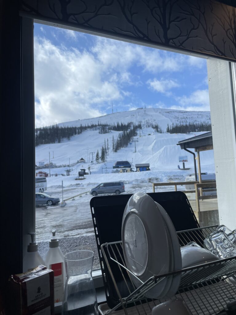 会場の脇ではノルディックのロングコースが果てしなく続く。スノーボードプロショップは多くなく、ローカルはスノーモービルでお気に入りの斜面にアクセスする文化を持つ。ゲストハウスのキッチンは“持ち寄り”の社交場で、レストランでは伝統のミートボールにベリージャムとマッシュポテト。支払いは完全キャッシュレスで、小さな子どもですら端末を自然に扱う。異文化の連続なのに、なぜか居心地がいい。