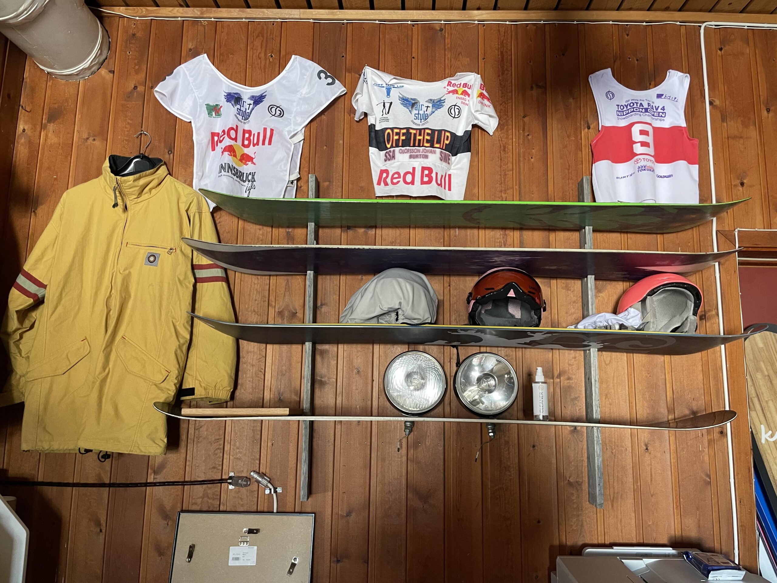 ヨハンのオフィスには日本で行われた大会のビブや。日本に行った時の思い出が沢山詰まっていた。