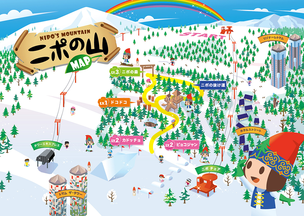 『ストーリー型ゲレンデ』とはどういうことか? 『アドベンチャーマウンテン』には悪者がいる。『チョッカリ大魔神』が森の木々を切り倒し、直滑降(チョッカリ)がしやすいゲレンデを作ろうと企んでいる。子どもたちはそんな悪だくみを阻止すべく、11個のミッションをクリア、そこにある各アイテムをゲットしていくことで、囚われた森の妖精『ニポ』を救出、ともに豊かな森を守るのだ。