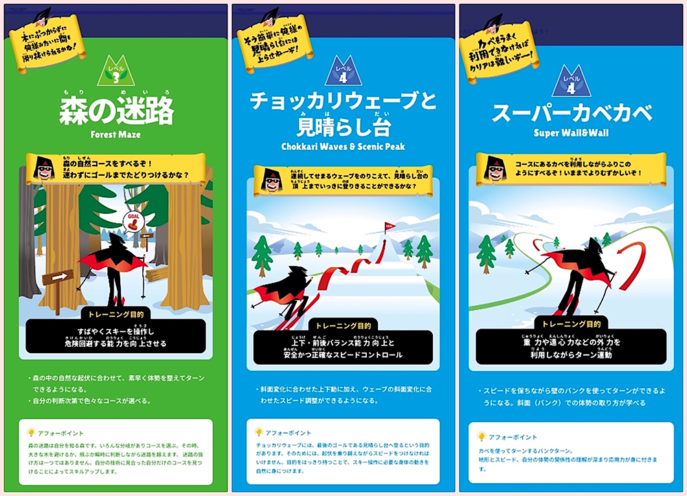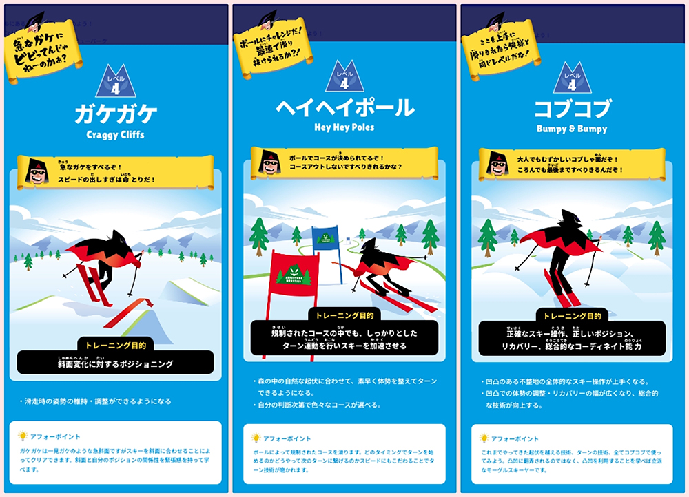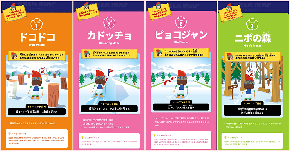 各ミッションは『アフォーダンス理論』に基づいており、視線の置き方・エッジワーク・バランス感覚・ボード操作などを自然に学べるようにデザインされている。つまりキッズは練習するのではなく“遊んでいたら上手くなってた”という感覚で雪山を楽しめるというわけだ。