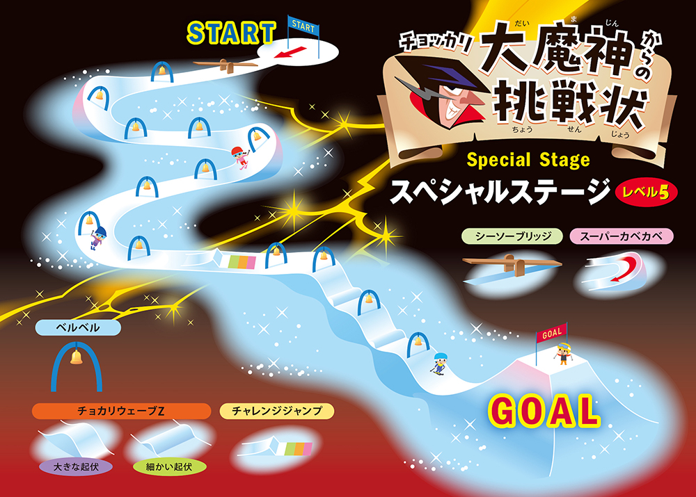 このステージには、スノーボードに必要な総合力を引き出す多彩なギミックが集結している。スピードコントロールとバランス感覚を問う『シーソーブリッジ』、滑りながらベルを鳴らす『ベルベル』、ボードの上下動で加速させる『チョッカリウェーブ Z』そして勇気を試す『チャレンジジャンプ』──どれもが単なる遊びではなく、雪上での判断力と体の使い方を磨く実践ステージだ。