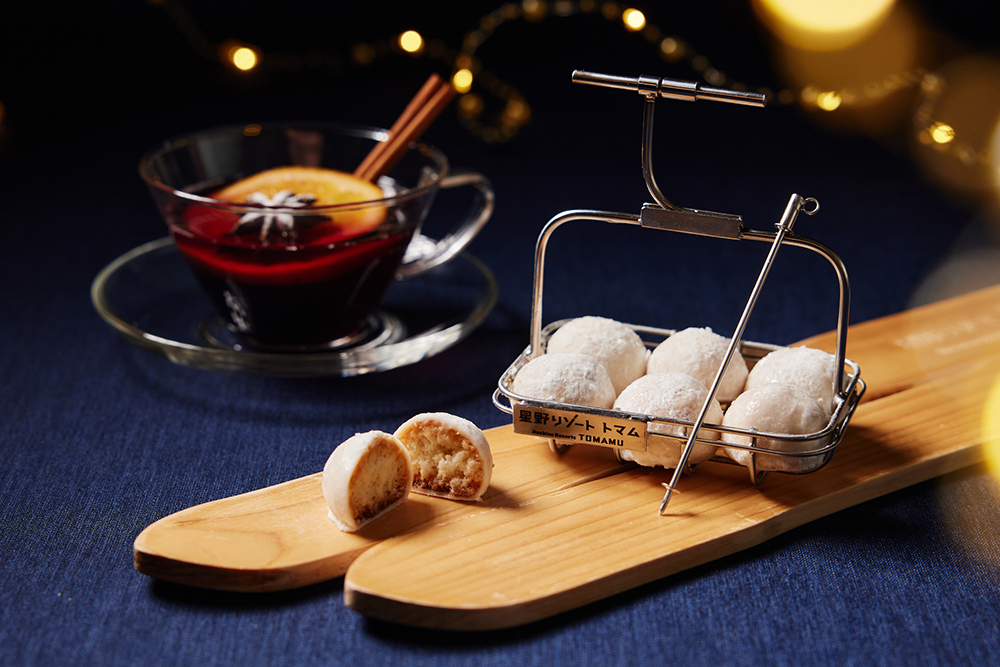 会場には、かつてトマムで実際に使われていたリフトをリメイクした『ペアリフトチェア』が設置される。座れば昼間の斜面や風やスピードがフラッシュバックしたりして‥‥。さらに雪をイメージしたオリジナルメニューも限定販売。『雪降るホットワイン』は、果実を乾燥させた中国由来のスパイス、スターアニスに粉糖をかけて雪をイメージ、シナモンを効かせた一杯。ホワイトチョコをコーティングした雪降る『スノーボール』は、リフト型のカゴにのせて供される。何もかもが雪つながりで、この場所ならではの世界観を楽しめる。