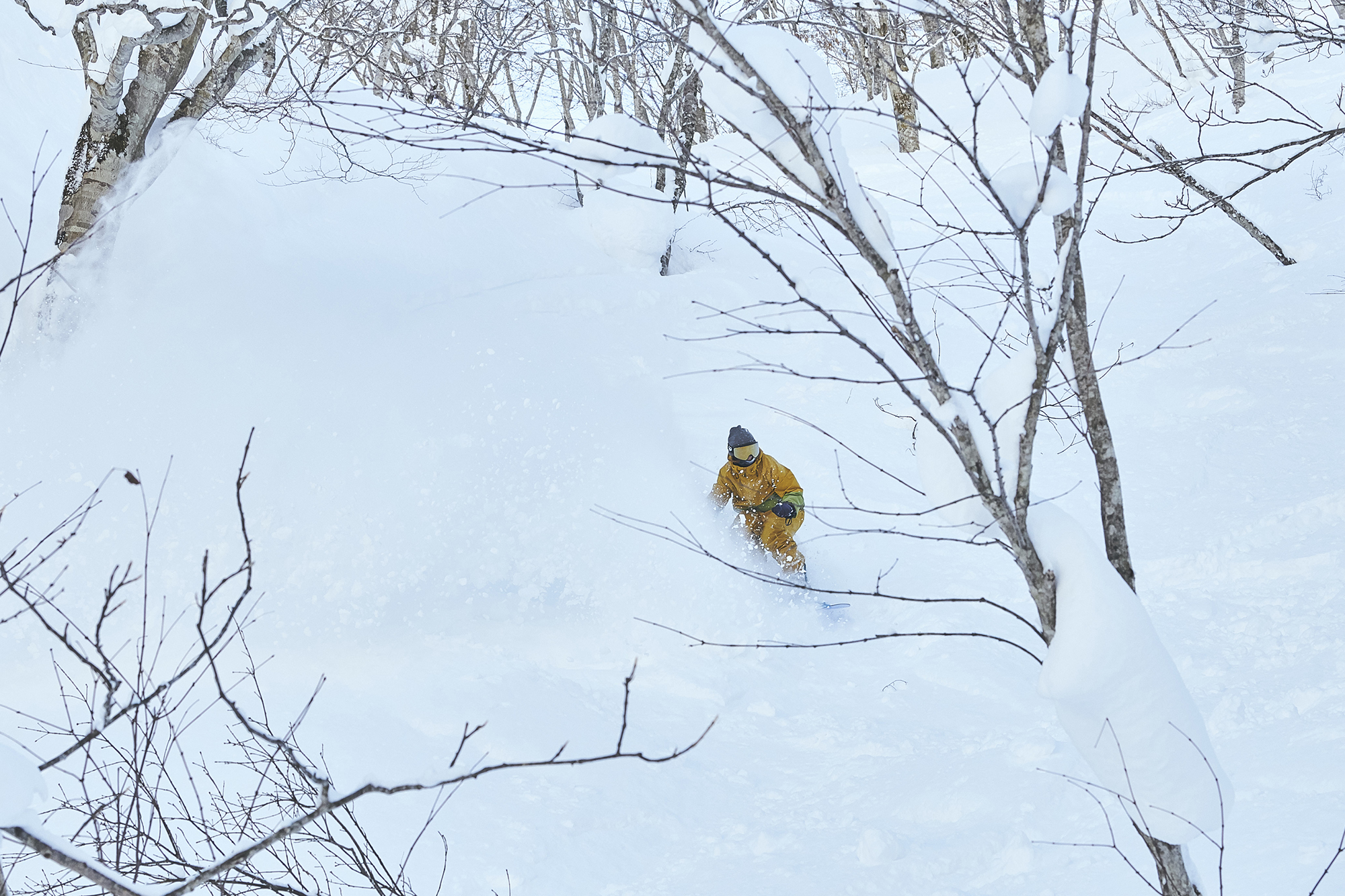 ターンのひとつひとつが、「今、この雪で、ここをどう滑るか」という問いになる。スピードを出すことも、大きなスプレーを上げることも目的ではない。自然の中で、最適な一本を描けたかどうか。その感覚が、滑り終えた後に強く残る。