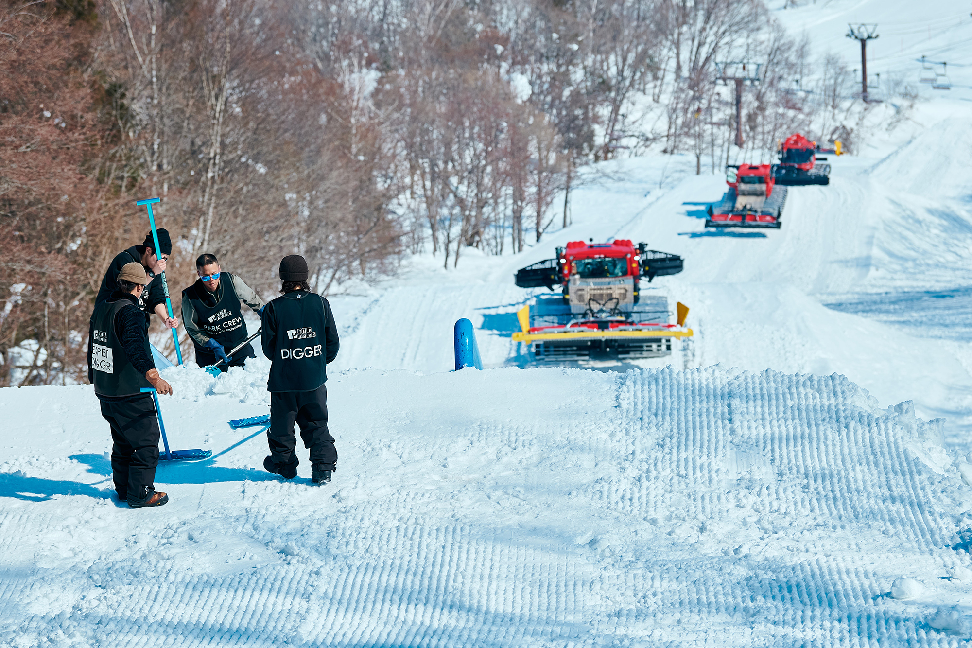 もうひとつ、TG PARKSが特別なのは、ゲレンデの流れの中に自然に組み込まれていることだ。パーク専用の一本を滑るのではなく、ロングクルーズの途中でラインを選ぶようにパークに入る。調子が良ければもう一周、疲れていればそのままフリーランへ。