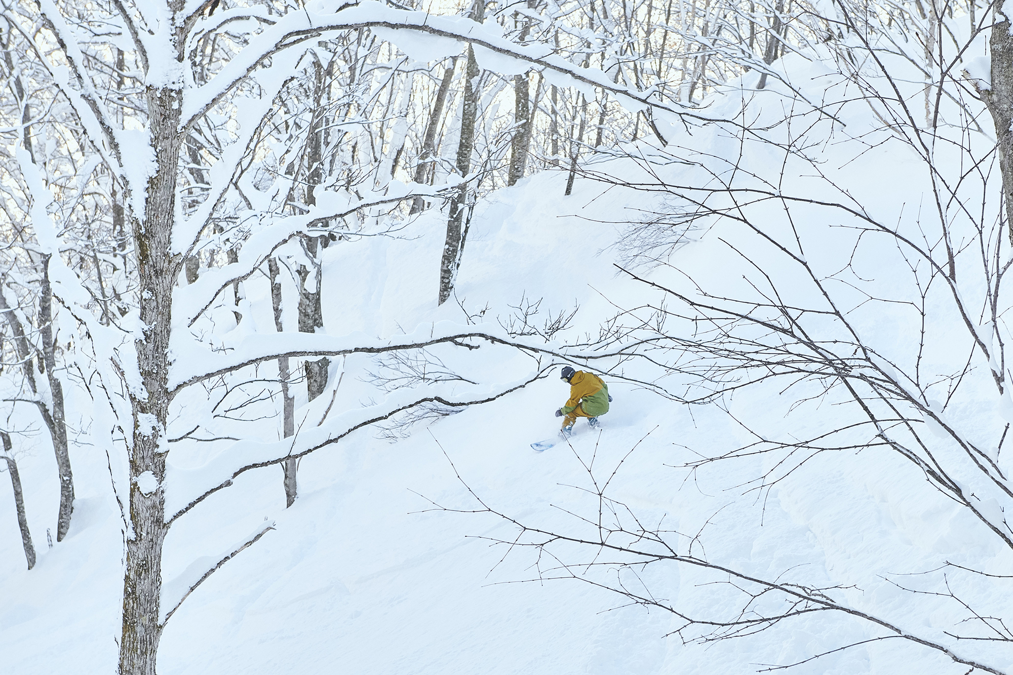 木立を縫いながらラインを探し、地形のうねりに合わせてスピードを調整する。板を踏み込むというより、雪の抵抗を使って浮かせ、向きを変える。